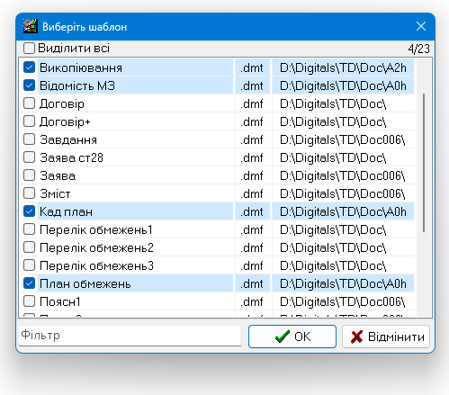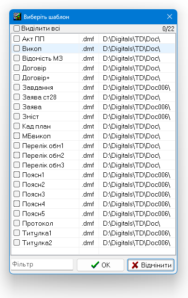 Як вони виглядають по кожному з видів документації, можна переглянути тут: До папок з шаблонами через пробіл можна додавати різні слова чи словосполучення. Наприклад, Doc004 ФОП, Doc004 Оренда. Тоді при формуванні буде виводитися діалогове вікно такого вигляду: