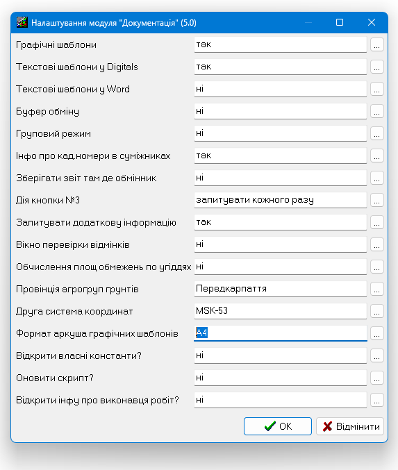 Так можна прописати будь-яку власну умову на основі інформації з майже усіх змінних. Наприклад, коли є акт — брати окремі сторінки з папки "акт", коли є оренда — з папки "оренда", коли власник "юр.особа" — окремі сторінки (договора) брати з якоїсь окремої папки. Див. відео, як створювати такі умови. Серед готових варіантів є такі: 1. Шаблони для тахеометра: якщо в налаштуваннях скрипту в змінній $GPS відсутні дані (це означає, що користувач не використовує GPS) — зміст і пояснювальна записка беруться з папки "тахеометр" (яка є окремо для кожного виду документації, крім 025). В іншому випадку беруться із звичайної папки. 2. Шаблони інших форматів: окремі папки А3h, А3v, А2h, А2v, А1h, А1v, А0h, А0v, де знаходяться окремі кадастрові плани, плани відведення, відомості МЗ, плани обмежень, викопіювання, схеми розподілу тощо інші (h — горизонтальної орієнтації, v — вертикальної). Щоб вибрати для графічних шаблонів інший формат, перед запуском скрипту потрібно натиснути кнопку налаштувань модуля і вказати тут потрібний формат: Один важливий нюанс — назви сторінок в загальній папці та у вкладеній папці мають бути ідентичними. Тільки так скрипт зможе їх замінювати. Не кожен шаблон кожного з перерахованих форматів є в наявності. Наприклад, Викопіювання є тільки форматів А2h, А2v, А3h, А3v. Тому, коли в налаштуваннях буде вибрано, наприклад формат А0h, то по кожному з шаблонів буде проводитися перевірка, чи наявний кожен з шаблонів потрібного формату у відповідній папці, і якщо ні — буде братися менший формат, що наявний. При цьому h рахується більшим за v. Тому в даному випадку для Викопіювання буде вибрано формат А2h: Серед готових також є окрема папка для Систем Солюшнс. Створення шаблонів для Digitals (відео) Для того, щоб додати свій шаблон, створіть чистий листок, вставте туди потрібний текст і в текст вставте відповідні змінні (див. файл Змінні скрипту.xls в папці TD чи тут на сайті). Збережіть файл у форматі dmf (текстовий шаблон) чи dmt (графічний шаблон) в одній із папок Doc, чи створіть додаткову папку DocХХХ, де ХХХ - вид документації і збережіть в ній. Для того, щоб вставити в документацію експлікації (угідь, суміжників, обмежень), відкрийте файл Digitals\TD\Doc\Таблички експлікацій.dmf і скопіюйте звідти одну із табличок у свій шаблон: