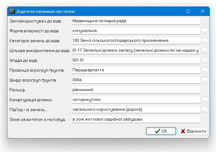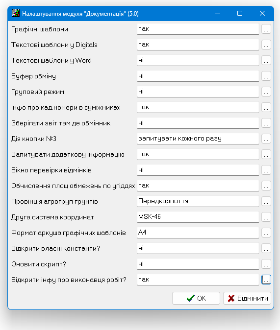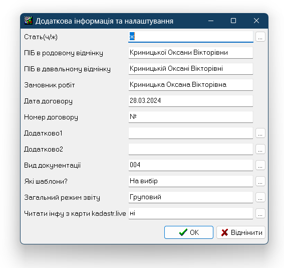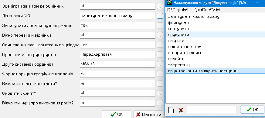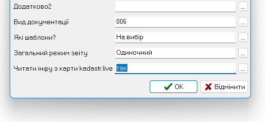 Перші три пункти дозволяють виключати відповідний тип шаблонів. Якщо Вам більше подобаються шаблони Word, то їх треба тут включити. Мінусом даних шаблонів є те, що вони досить довго генеруються і нема можливості вибирати для формування тільки окремі сторінки (бо якщо на кожну сторінку Word зробити окремий шаблон — то тоді кілька тахи шаблонів будуть формуватися кілька хвилин. Але перевагою в них є більш зручне форматування тексту і перенос на нові сторінки. Буфер обміну дозволяє передавати всі дані з xml у таблицю ексель, з якої потім так само (але іншим способом) можна формувати звіт за шаблонами в MSWord чи OO Writer за допомогою передачі даних в буфер та програмного "злиття" таблиці даних із текстовим редактором. Про це детальніше нижче. Груповий режим дозволяє читати інформацію зразу з усіх відкритих файлів XML. Обробляються тільки ті обімнники, які відкриті праворуч від активної вкладки. Якщо праворуч від активної вкладки не відкрито жодного обмінника - то опція працює в одиничному режимі. Даною опцією задається значення за замовчуванням для опції, яка є у вікні, що з'являється при кожному запуску скрипту. Рекомендується використовувати постійно одиничний режим і переключатися в груповий тільки тоді, коли потрібно сформувати документацію зразу на декілька ділянок. Інфо про кадастрові номери в суміжниках дозволяє автоматично показувати в суміжниках в дужках їх кадастрові номери або "(кадастровий номер не визначено)" — якщо кадастровий номер суміжника відсутній. Кадастрові номери беруться з відповідного параметра (id7001000) кожного суміжника на закладці Інфо. Туди їх можна заносити як вручну, так і автоматично даним скриптом. Щоб суміжники автоматично отримували кадастрові номери, потрібно включити опцію Читати інфо з карти kadastr.live в головному вікні програми: Коли ця опція включена — кадастрові номери беруться самі з відповідного сайту, але вони там станом ще на лютий 2023 року. Щоб даною опцією піддтягувалися нові кадастрові номери, можна створити власну карту на основі викачаних ділянок з НКС за допомогою такого СКРИПТУ. (як це зробити — відео) При включеній опції Зберігати звіт там, де обмінник, готовий звіт буде автоматично зразу під час формування зберігатися у папці Документація, яка буде створена у тій же папці, де файл XML. Готовий звіт буде зберігатися у форматі dmf. Окрім цього, якщо дана опція включена, то коли вибирати опцію на третій кнопці Закрити (усі), всі сторінки будуть зберігатися при закриванні (інакше вони закриваютсья без збереження). Дія кнопки №3 дає можливість вбирати те саме, що можна вибрати самою кнопкою №3, але закріпити це на постійній основі. Тобто, якщо тут вибрати "Друкувати" — то кнопка 3 зразу без діалогу буде тільки друкувати сторінки тощо. Є тут ще окрема опція друк -> закрити -> відкрити наступну, яка дозволяє кнопці працювати в режимі, який був колись у версії 4. Тобто, кнопка 3 буде пролистувати, друкувати та закривати сформовані звіти. Запитувати додаткову інформацію включає/виключає додаткові поля для заповнення дати та номера договору та іншої додаткової інформації (поля Додатково 1 та Додатково 2), а також за одно включає/виключає додаткове діалогове вікно для проєкту відведення, де вводиться інформація про існуючий стан ділянки до відведення. Не рекомендується її відключати. Опція Вікно перевірки відмі